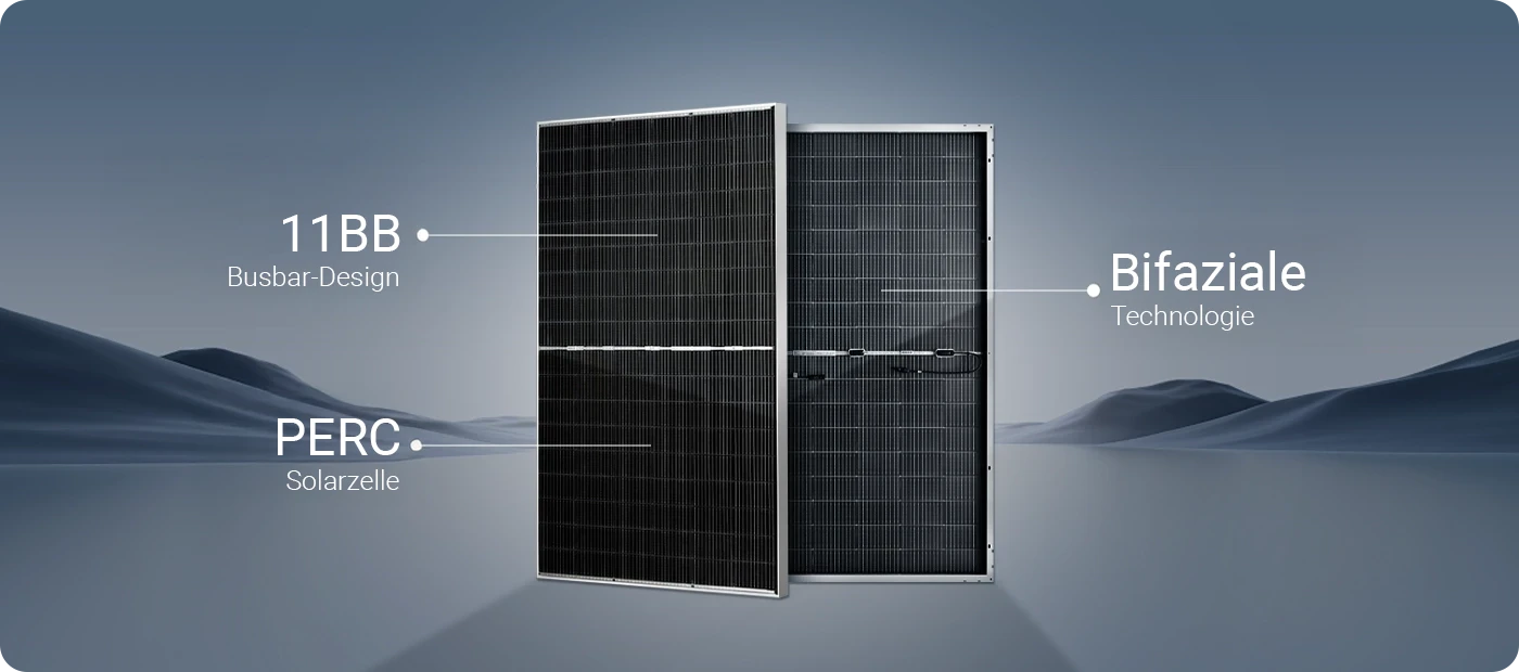 Bifaziale Solarmodule können Sonnenlicht von beiden Seiten aufnehmen. Zusätzlich zu der Stromerzeugungseffizienz von 22.7 % bieten doppelt verglaste Module unter idealen Bedingungen eine Stromerzeugungssteigerung von bis zu 22 %.