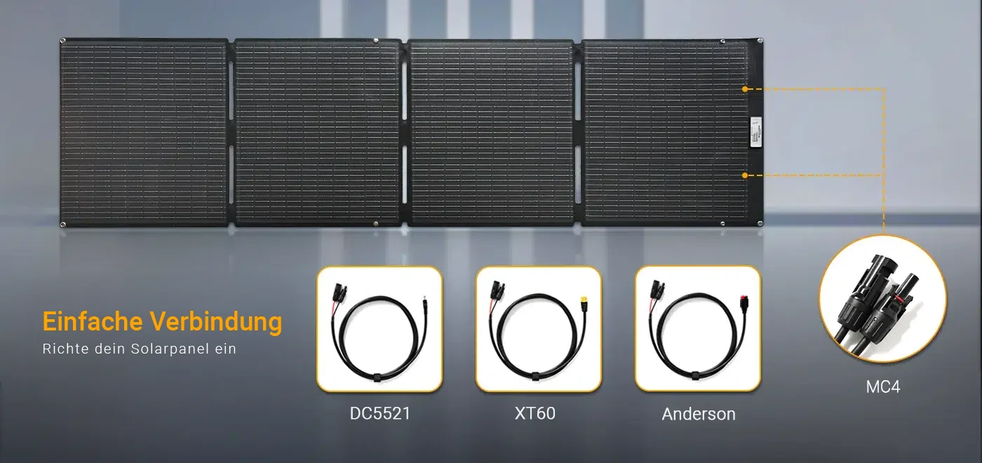 Die MC4-Anschlüsse befinden sich auf der Rückseite der Solarzellen. Sollte Ihr mobiler Energiespeicher jedoch über eine andere Schnittstelle verfügen, beispielsweise XT60, DC5521 oder eine andere, ist das kein Problem. Sie können Anderson-Steckverbinder verwenden, um ihn an die benötigte Schnittstelle anzuschließen.