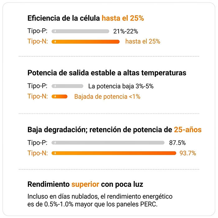Los paneles solares TOPCon ofrecen una eficiencia celular del 26,1 % y una tasa de degradación del 0,25 % al año. Funcionan mejor que los paneles PERC tradicionales en cualquier clima.