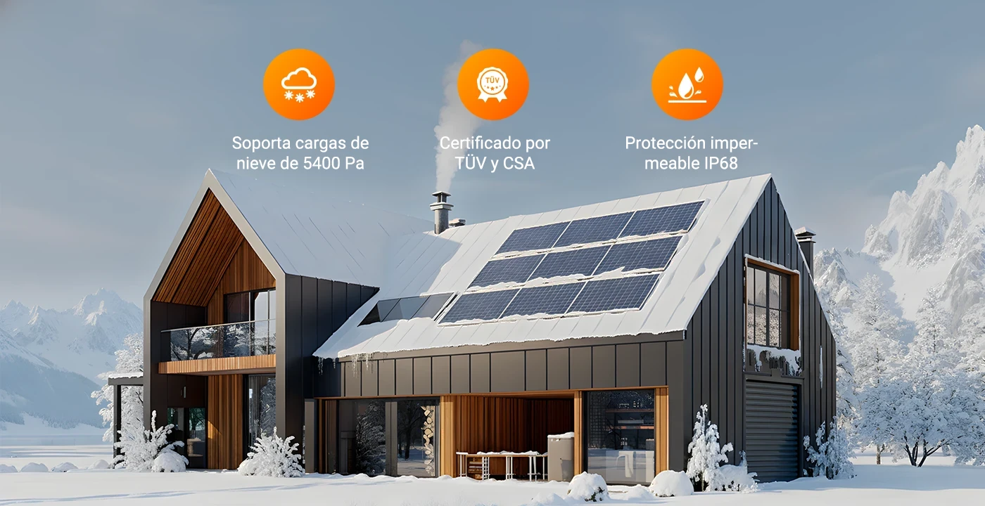 El panel incorpora orificios pretaladrados en la parte posterior del marco de aluminio para facilitar el montaje. Es compatible con soportes tipo Z, montajes inclinables y otros sistemas universales de montaje solar.